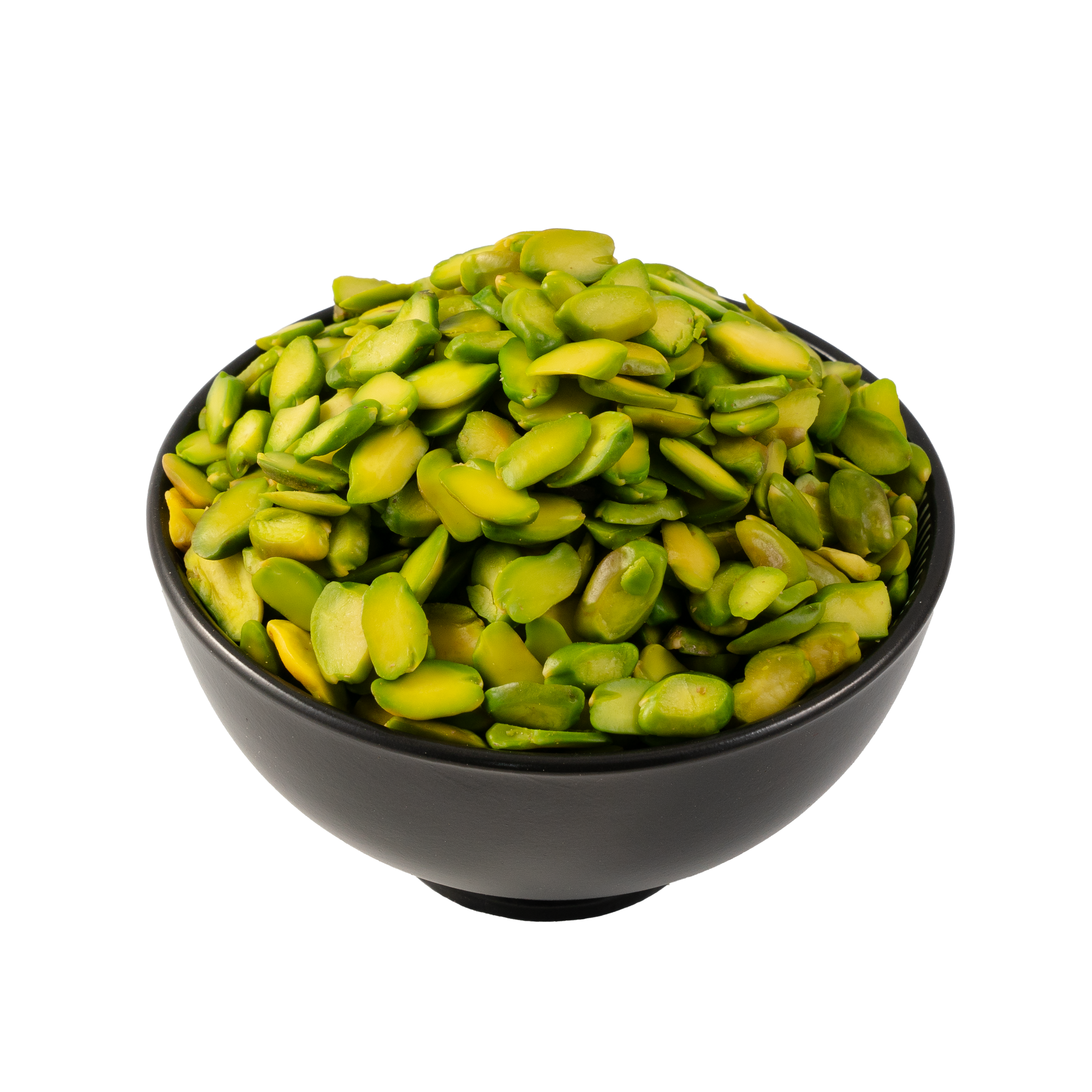 رنگ سبز طبیعی مغز پسته با کمی کرم روشن در بخشهای داخلی، ورقههای یکدست و تازه